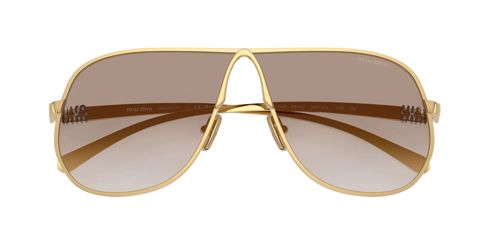 Τα γυναικεία γυαλιά ηλίου Miu Miu SMU A56 5AK-90L είναι κατασκευασμένα στην Ιταλία και αποτελούν μέρος της Collection άνοιξη-φθινόπωρο 2025. Σε aviator large σχήμα, τα γυαλιά ηλίου Miu Miu SMU A56 5AK-90L, διαθέτουν μεταλλικό σκελετό στην απόχρωση του χρυσού χρώματος. Το χαρακτηριστικό χρυσό λογότυπο στους βραχίονες, προσδίδει πολυτέλεια που αντικατοπτρίζει τη διαχρονική κομψότητα και τη δεξιοτεχνία της Miu Miu. Τα γυαλιά ηλίου Miu Miu SMU A56 5AK-90L φέρουν φακούς σε καφέ degrade χρώμα, προσφέροντας 100% UV προστασία στα μάτια σας απέναντι στις βλαβερές ακτίνες του ήλιου. Ιδανική επιλογή για εμφανίσεις που δεν περνούν απαρατήρητες!